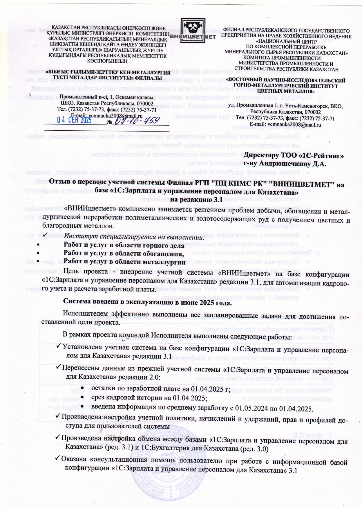 Внедрение учетной системы «ВНИИцветмет» на базе конфигурации «1С:Зарплата и управление персоналом для Казахстана» редакции 3.1 для автоматизации кадрового учета и расчета заработной платы.