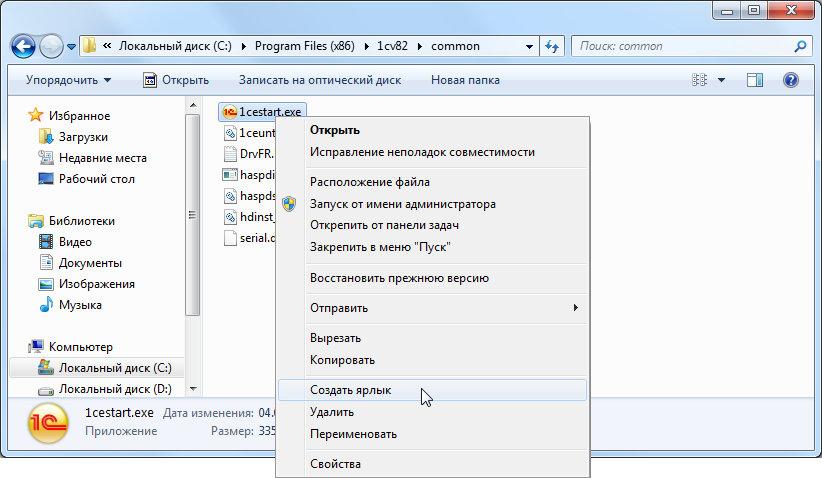 В результате выполнения этого действия в каталоге появится новый файл с именем «1cestart.exe - Ярлык».