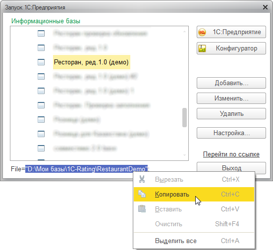 Слово «File» в начале строки означает, что данная информационная база работает в файловом варианте. Скопируем путь к информационной базе: выделим его левой кнопкой мыши, нажмем на выделенный текст правой кнопкой мыши и в контекстном меню выберем пункт «Копировать».