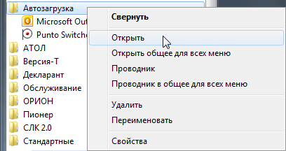 Для этого откроем каталог автозагрузки через меню «Пуск – Все программы - Автозагрузка», нажмем правой кнопкой мыши на элемент меню «Автозагрузка» и выберем в контекстном меню пункт «Открыть».