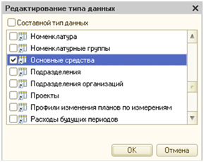 Система позволяет устанавливать для разреза составной тип значений. Если имеющегося перечня типов недостаточно, то его состав можно расширить в конфигураторе, но, как правило, таких действий не требуется.