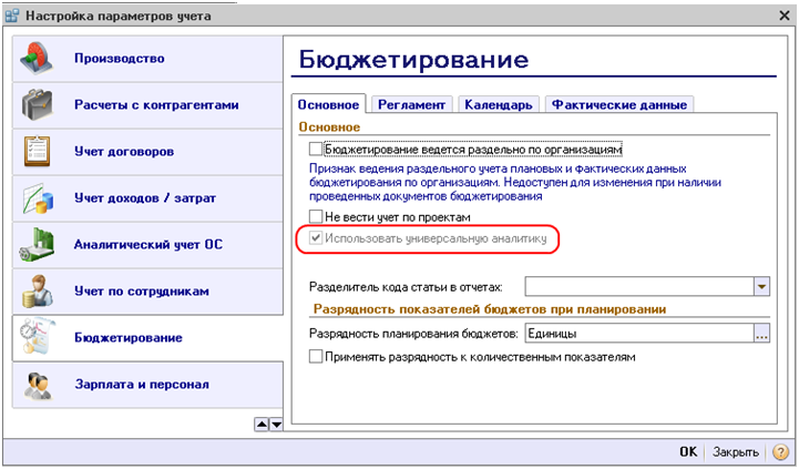 Для использования дополнительных разрезов аналитики необходимо включить механизм универсальной аналитики в параметрах учета.