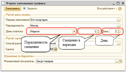 При расчете дат платежей необходимо указать период заполнения, т.е. интервал времени, в котором будет осуществляться оплата, периодичность – частоту оплаты, а также день платежа с возможностью указания смещения. Например, по данным формы заполнения графика даты оплаты будут рассчитаны следующим способом – каждый месяц, во второй день второй недели месяца оплаты.
