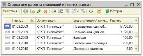Размеры основной стипендии и стипендии подготовительного курса предварительно заносятся в регистр сведений «Базовые показатели расчета стипендий». В регистре указывается дата начала действия показателя и размер.