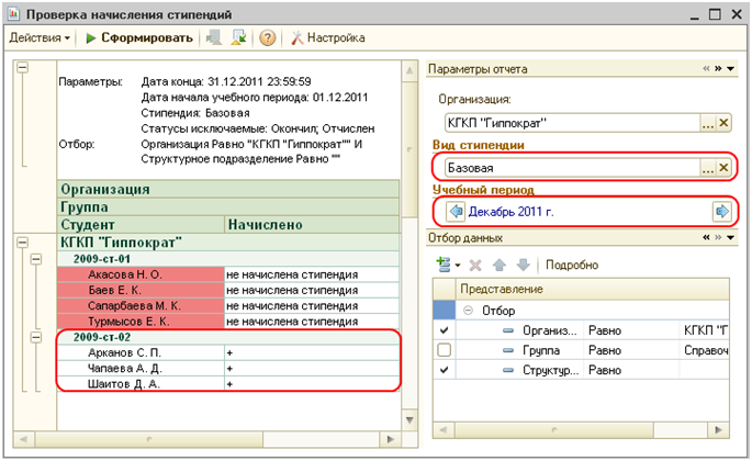 В отчете выводится список всех студентов, которым должна быть начислена указанная стипендия/выплата в данном периоде. Те студенты, которым за указанный учебный период была начислена данная стипендия/выплата, помечаются знаком «плюс». Строки со студентами, которым стипендия/выплата не была начислена, выделяются красным цветом.