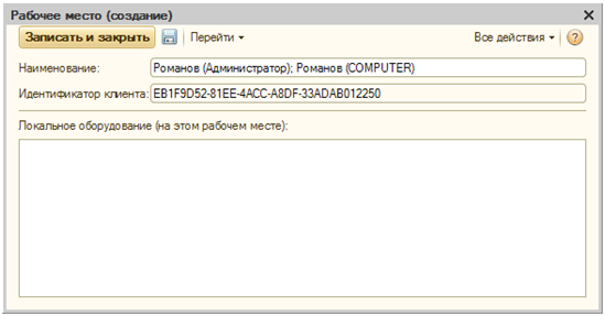 При создании для нового рабочего места автоматически генерируется наименование в соответствии с наименованием пользователя информационной базы и именем компьютера. Также автоматически будет сгенерирован идентификатор клиента. В поле «Локальное оборудование (на этом рабочем месте)» в дальнейшем будет отображаться перечень оборудования, подключенного к данному рабочему месту.