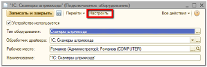 В открывшейся форме необходимо выбрать обработчик драйвера из списка доступных для сканера штрих-кодов и установить признак того, что устройство будет использоваться данным пользователем, кроме этого, необходимо указать рабочее место. Наименование элемента справочника будет заполнено системой автоматически. Для возможности настройки подключенного оборудования необходимо сохранить данный элемент справочника при помощи соответствующей кнопки панели инструментов справочника.