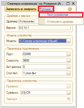 Работу подключенного устройства с указанными параметрами можно протестировать. Для этого необходимо воспользоваться пунктом «Тест устройства» меню «Функции» командной панели формы настроек.