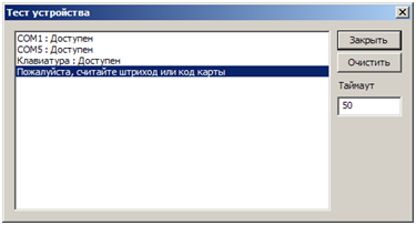 Для проверки работоспособности сканера штрих-кода необходимо считать штрих-код товара с помощью сканера штрих-кодов. Если параметры устройства настроены правильно, появится строчка с номером прочитанного штрих-кода, соответственно тест устройства пройден успешно.