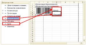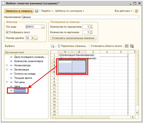 Теперь добавим штрих-код, выберем область, состоящую из двух ячеек по горизонтали, четырех по вертикали, добавим поле «Штрих-код» и соглашаемся с тем, что штрих-код будет добавлен картинкой.