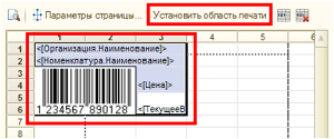 Далее установим область печати создаваемого шаблона. Для этого необходимо выделить заполненную область в поле табличного документа и нажать кнопку «Установить область печати».