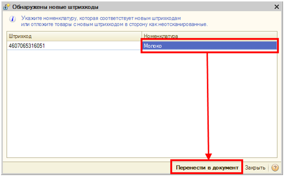 При последующем считывании данных штрих-кодов номенклатура, соответствующая им, будет устанавливаться уже без дополнительных действий.