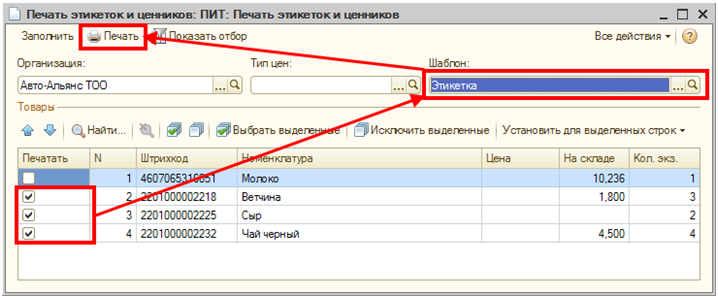 Теперь необходимо распечатать этикетки со сгенерированными штрих-кодами. Строкам с номенклатурой, для которой были сгенерированы штрих-коды, необходимо установить признак «Печатать». В реквизите «Шаблон» шапки обработки необходимо выбрать созданный ранее шаблон «Этикетка» и нажать кнопку «Печать».