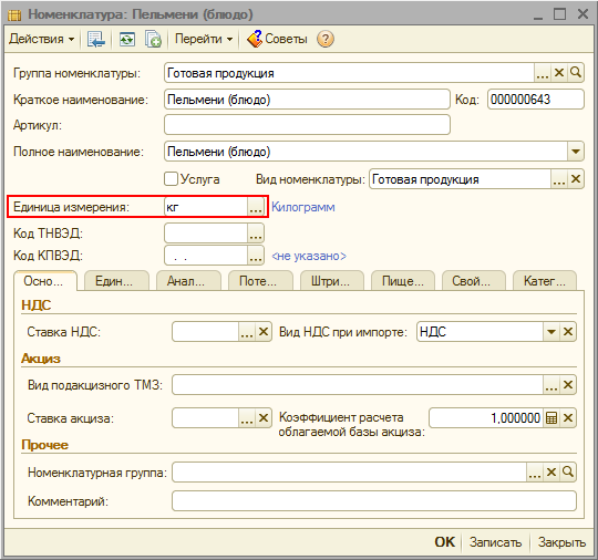 Чтобы значение коэффициента устанавливалось в табличную часть «Ингредиенты» автоматически, при выборе номенклатуры «Пельмени (готовые в упаковке)», можно один раз задать коэффициент пересчета для купленных пельменей из килограммов в упаковки. Для этого в карточке номенклатуры «Пельмени (готовые в упаковке)» на закладке «Единицы измерения» необходимо ввести исходную единицу измерения – килограмм, результирующую единицу измерения – упаковка и коэффициент пересчета равный 2,5.