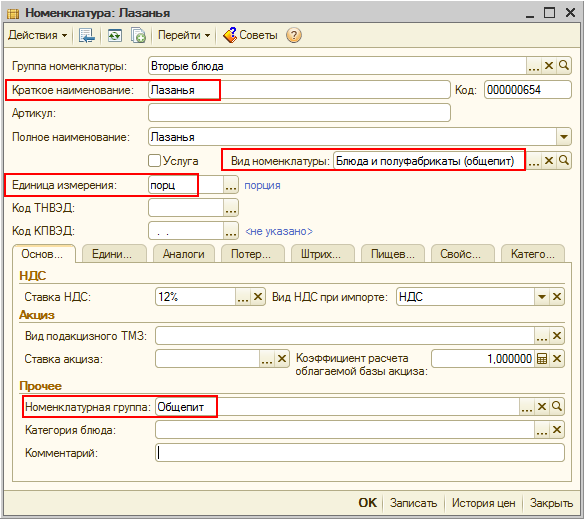 Сначала создадим новый элемент справочника «Номенклатура» - блюдо «Лазанья» и заполним необходимые реквизиты.