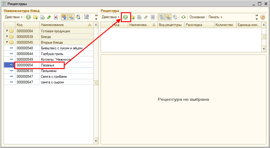 Далее создадим для блюда «Лазанья» рецептуру его приготовления. Для этого в левой части формы регистра сведений «Рецептуры», из перечня номенклатуры выбираем блюдо «Лазанья». При помощи кнопки «Добавить» командной панели табличной части «Рецептуры» создаем рецептуру для нашего блюда. Для каждого блюда можно создавать неограниченное количество рецептур.
