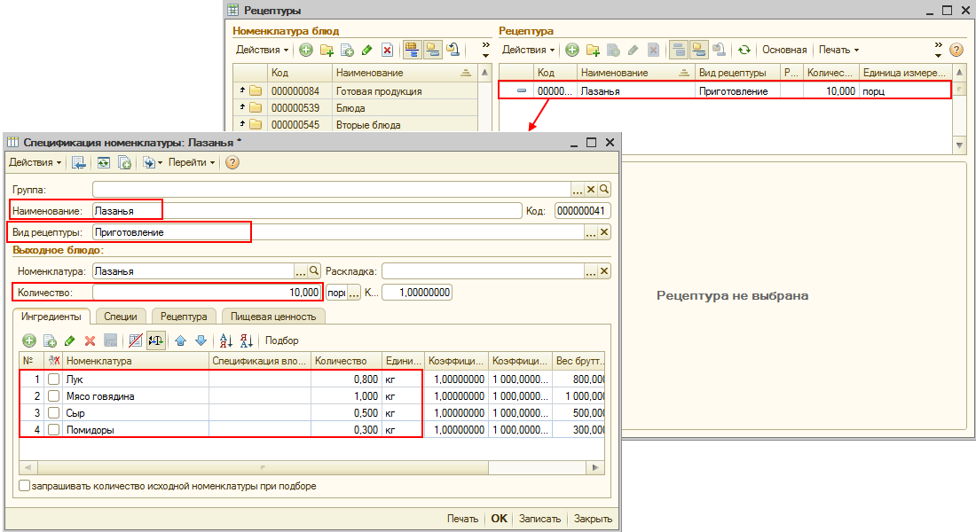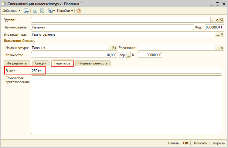 Для работы с рецептурами используется справочник «Спецификации номенклатуры». Для создаваемой рецептуры заполняем наименование блюда – «Лазанья», вид рецептуры – «Приготовление», а также количество порций, на которое будет создана рецептура (в нашем случае – на 10 порций). В табличной части «Ингредиенты» указывается перечень и количество ингредиентов, которые будут использоваться при приготовлении блюда.