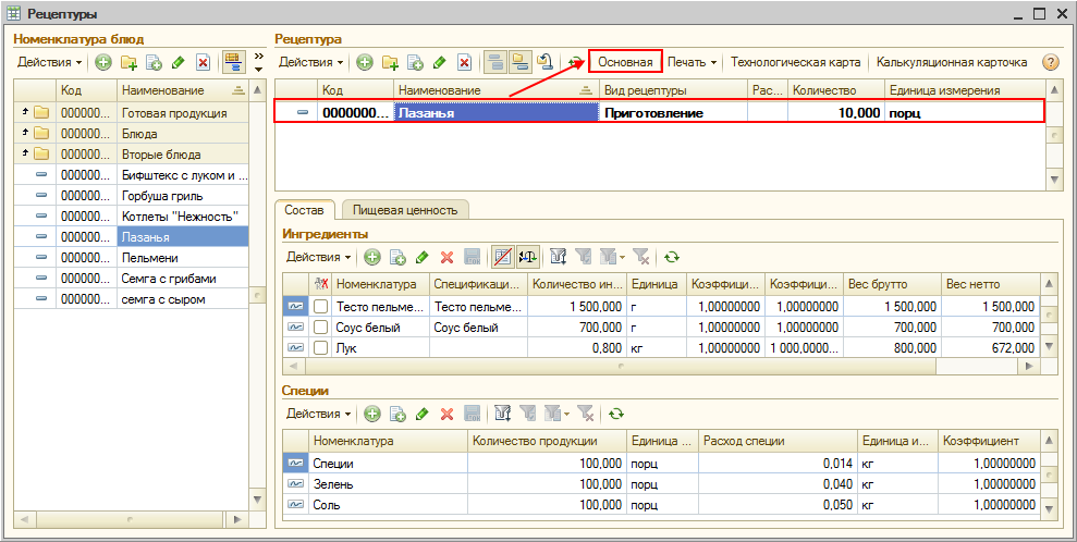 В регистре сведений «Рецептуры», при помощи кнопки «Основная», назначаем рецептуру блюда «Лазанья» основной, для автоматического заполнения данной рецептуры в документы и отчеты.