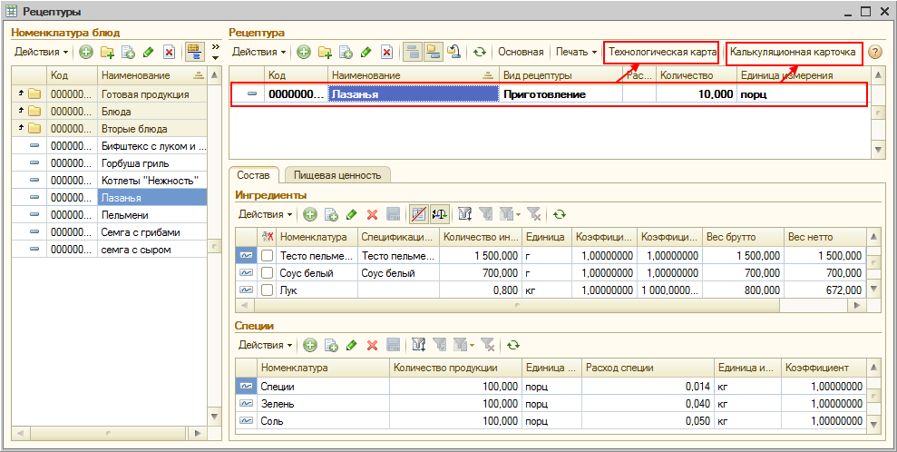 Дополнительно у рецептур приготовления есть еще три табличные части: «Специи», «Рецептуры» и «Пищевая ценность». При приготовлении нашего блюда «Лазанья» используются специи. Укажем их перечень в соответствующей табличной части.