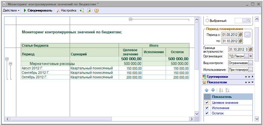 Анализ ситуации по тому, какие контролирующие параметры введены в систему, достигнуты ли целевые показатели, можно провести, сформировав отчет «Контролируемые значения по статьям оборотов». В отчет выводятся данные по: