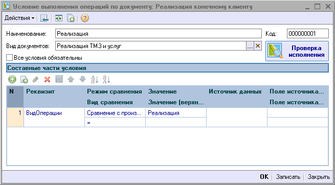 Табличная часть «Составные части условия» представляет собой список условий на данные документа, где каждая строка списка редактируется в отдельном окне. Добавим строку в табличную часть и в открывшемся окне установим значения, удовлетворяющие нашему условию.