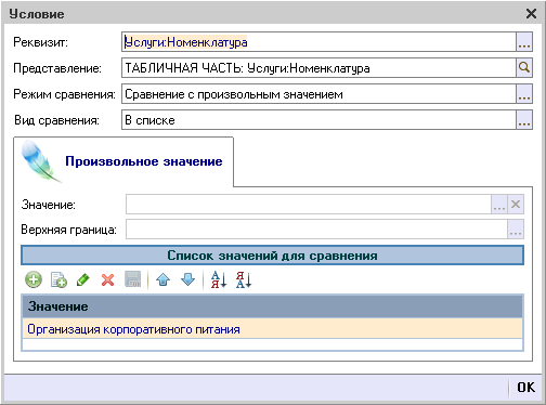 Значение в поле «Представление» сгенерируется автоматически. Укажем режим сравнения «С произвольным значением», вид сравнения «В списке». В табличной части «Список значений для сравнения» добавим новую строку и в открывшейся по кнопке выбора форме списка справочника «Номенклатура» выберем услугу «Организация корпоративного питания», сохраним условие.