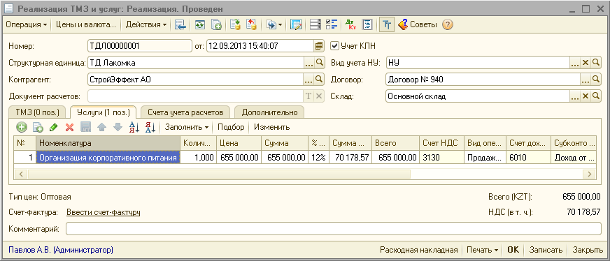 Проверим работу схемы отражения фактических данных. В августе 2013 года компанией была реализована услуга по организации корпоративного питания на сумму 655 000 тенге. Для отражения данной операции в конфигурации «1С-Рейтинг: Управление финансами и бюджетирование для Казахстана», создадим документ «Реализация ТМЗ и услуг». В табличной части «Услуги», укажем услугу «Организация корпоративного питания», количество 1, сумму 655 000 тенге, заполним все необходимые поля и проведем документ.