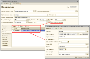 Для одной позиции номенклатуры может быть задано любое количество элементов справочника «Серии номенклатуры». При добавлении новой позиции номенклатуры в табличную часть документа, пользователь выбирает нужную серию для той номенклатуры, для которой установлен флаг ведения учета по сериям.