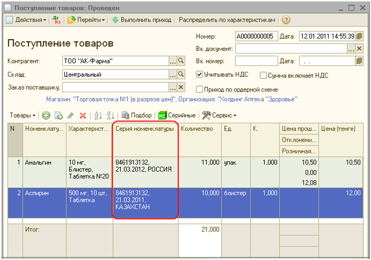 Конфигурация предоставляет возможность хранить информацию о серийном номере, номере и дате сертификата, дате выпуска, сроке годности, производителе и стране происхождения лекарственного средства, то есть вести учет по сериям.