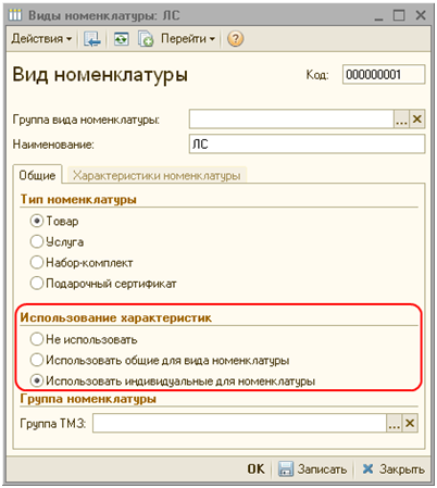 При установленном значении «Не использовать» учет по характеристикам номенклатуры вестись не будет. При установленном значении «Использовать общие для вида номенклатуры», для всех номенклатур будут установлены характеристики, указанные на закладке «Характеристики номенклатуры» элемента справочника «Вид номенклатуры».