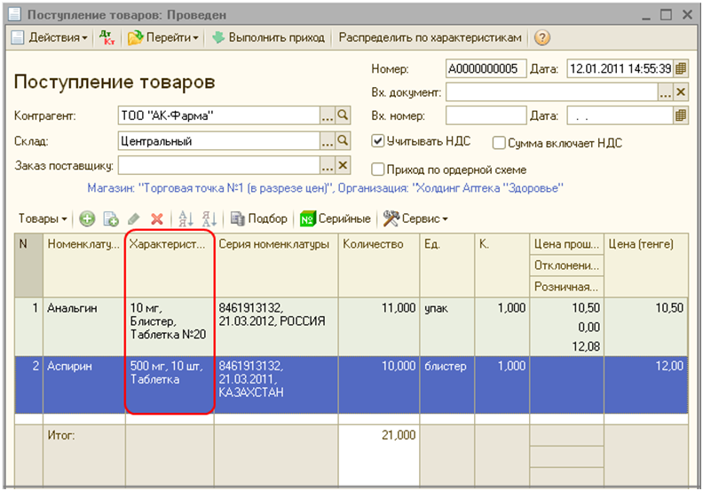 Например, аспирин поставляется в блистерах по 10 таблеток, но дозировка может равняться 100 мг. или 500 мг. Тогда необходимо создать две характеристики номенклатуры. В первой необходимо указать дозировку – 100 мг., фасовку – 10 шт., форму выпуска – «Таблетки». Во второй дозировку – 500 мг., фасовку – 10 шт., форму выпуска – «Таблетки». Таким образом, в системе был зарегистрирован аспирин с двумя видами дозировки, используя только один элемент справочника «Номенклатура». В дальнейшем, при регистрации поступления лекарственного средства, необходимо будет в поле «Характеристика» выбирать соответствующую характеристику.