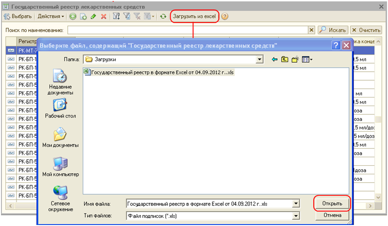 Государственный реестр лекарственных средств из файла Excel загружается в одноименный регистр сведений, из которого впоследствии производится подбор номенклатуры. Чтобы загрузить государственный реестр лекарственных средств, необходимо через меню «Операции» - «Регистры сведений» открыть форму регистра сведений «Государственный реестр лекарственных средств» и нажать кнопку «Загрузить из excel» командной панели регистра. В открывшемся диалоговом окне необходимо выбрать нужный файл Excel и нажать кнопку «Открыть». После этого начнется загрузка реестра в регистр сведений. При повторной загрузке файла сроки регистра сведений будут перезаписаны.