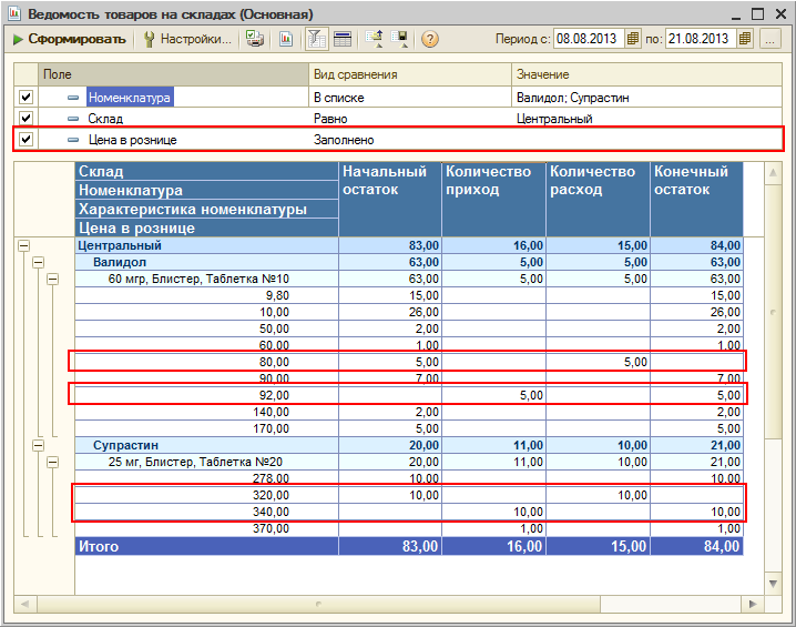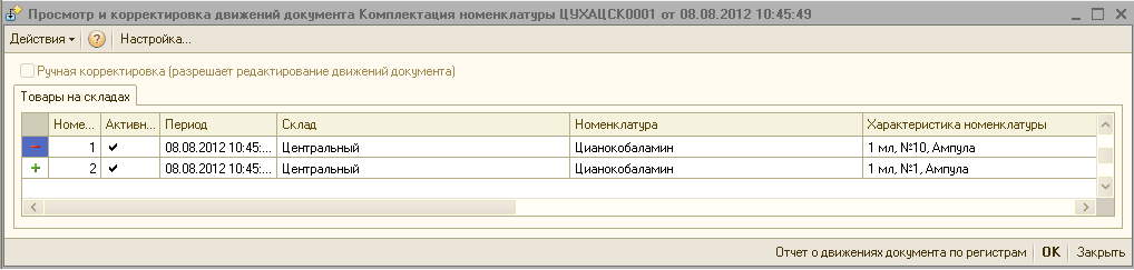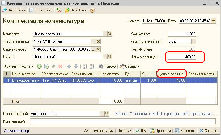 Например, при проведении документа со склада спишется 1 упаковка Цианокобаламина по текущей цене, а приход произойдет в количестве 10 ампул по новой установленной цене.