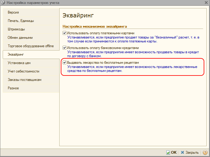 Для включения возможности использования механизма выдачи лекарственных средств по бесплатным рецептам необходимо в настройках параметров учета информационной базы (меню «Сервис» → «Настройка учета») на закладке «Эквайринг» установить признак «Выдавать лекарства по бесплатным рецептам».