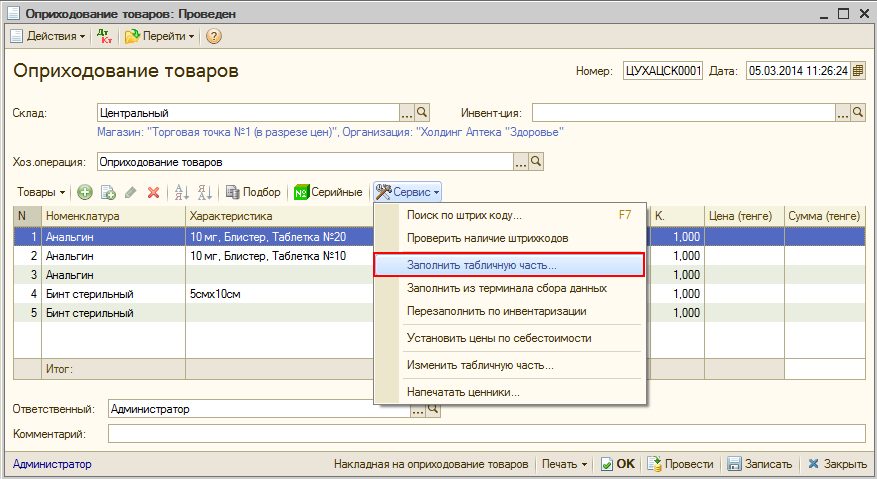 - при помощи обработки «Заполнить табличную часть» (меню «Сервис» → «Заполнить табличную часть»);