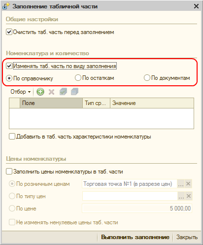 Критерии отбора задайте в табличной части «Отбор», установите флаг «Изменять табличную часть по виду заполнения». Отбор возможен по справочнику «Номенклатура», по остаткам товаров на складах и по документам.