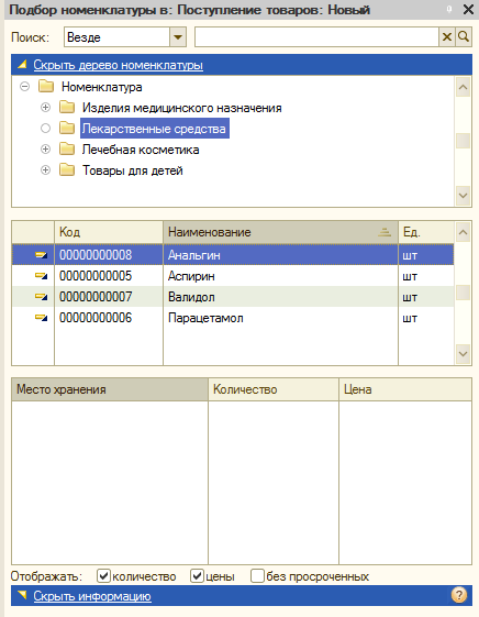 Рассмотрим окно подбора при учете остатков в разрезе розничных цен. Окно подбора представляет собой иерархическую структуру справочника «Номенклатура». Для каждой позиции номенклатуры в форме подбора отображается дополнительная информация о единице измерения, в которой хранится номенклатура, и остатке данной номенклатуры на складе аптеки.