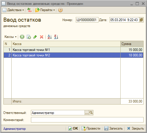 В табличной части документа указывается перечень касс, по которым вводятся остатки, и для каждой кассы указывается сумма остатка.
