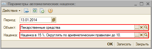 Регистр сведений «Параметры автоматических наценок» используется в механизме автоматического расчета розничной цены номенклатуры при ведении учета остатков в разрезе цен. Значение параметра автоматической наценки может изменяться не чаще, чем один раз в день. Регистр определяет, какая наценка должна применяться к номенклатуре при определении ее розничной цены. Процент наценки можно задать для лекарственного средства, для группы лекарственных средств или для вида номенклатуры.
