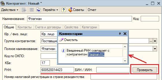 В случае если в программе работает несколько пользователей, отвечающих за работу с клиентами и поставщиками, возможны случаи, когда заводятся «повторяющиеся» карточки контрагентов. Это, как правило, приводит к сложностям при составлении актов сверки и вносит путаницу в работу. Чтобы избежать таких ситуаций, в 1С:Бухгалтерии 8 появилась возможность проверки дублирующих записей о контрагентах. При нажатии на кнопку «Проверка» в разделе сведений о РНН и БИН проводится не только проверка правильности контрольного разряда в этих данных, но и проверка существования в информационной базе других контрагентов, имеющих аналогичный РНН или БИН.