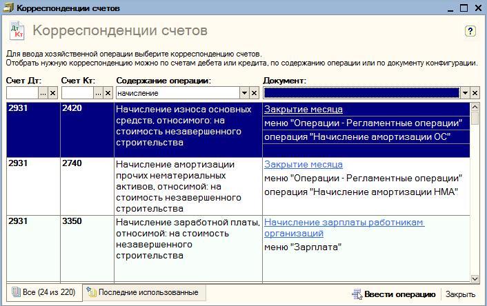 Для каждой операции указан документ, который предназначен для ее отражения в 1С:Бухгалтерии 8. Документ можно ввести непосредственно из формы просмотра типовых корреспонденций, щелкнув по названию документа (подчеркнуто и выделено синим цветом).