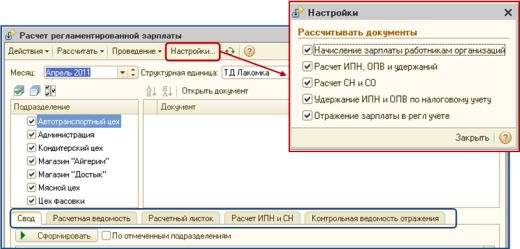 Например, воспользуемся нашим мастером расчета зарплаты и начислим в ТОО «ТД Лакомка» заработную плату за апрель 2011 года двум подразделения: магазин «Достык» и автотранспортному цеху. Для этого через меню «Настройка» установим виды создаваемых документов: