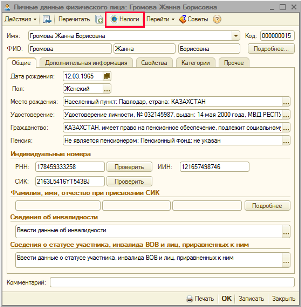 Для работников, являющихся пенсионерами, оформление карточки физического лица выполняется аналогично заполнению, указанному в п.1., при этом с указанием признака «Пенсионер» в графе «Пенсия». В этом случае при расчете документов «Расчет ИПН, ОПВ и удержаний», «Расчет СН и СО» суммы ОПВ и СО рассчитываться не будут.