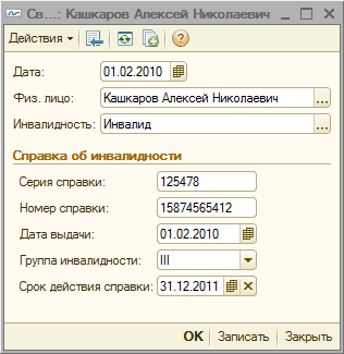 При наличии у работника справки об инвалидности I, II, III групп для предоставления льготы при расчете ИПН в карточке физического лица в графе «Сведения об инвалидности» необходимо заполнить серию справки, номер справки, дату выдачи, группу инвалидности, срок действия справки, инвалидность.