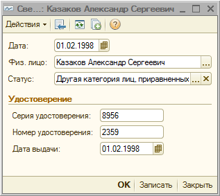 Для применения льготы работникам – участникам ВОВ, инвалидам ВОВ, и лицам, приравненным к ним, в карточке физического лица в графе «Сведения о статусе участника, инвалида ВОВ, и лиц приравненных к ним» необходимо заполнить данные о серии удостоверения, номере удостоверения, дате выдачи, статусе работника.