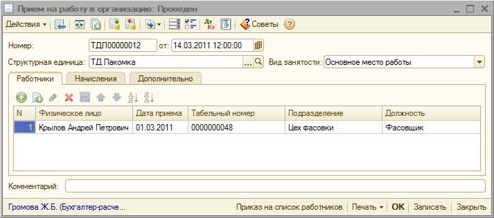 Документ «Кадровое перемещение» служит для отражения повышения тарифных ставок работников, перемещения между подразделениями и смены должности.