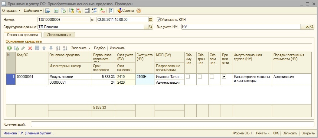Документ «Принятие к учету ОС» оформляется после отражения поступления самого основного средства. Рекомендуется вводить данный документ на основании документа «Поступление ТМЗ и услуг».