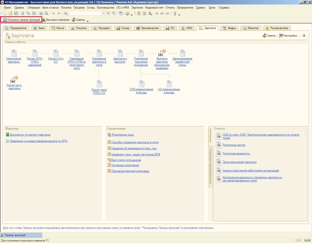 Чтобы успешно приступить к работе, после установки конфигурации «Бухгалтерия 8 для Казахстана», необходимо выполнить заполнение основных сведений. Начинать работу с программой, прежде всего, следует с ввода сведений о вашем предприятии, учет хозяйственной деятельности которого вы будете вести в программе. Для этого необходимо поэтапно выполнить несколько шагов. Выполнить эти шаги может помочь статья, которая была опубликована на диске ИТС за октябрь 2011 года «С чего начинать работу в конфигурации «Бухгалтерия 8 для Казахстана», а также вы можете использовать встроенные в конфигурацию помощники, расположенные на рабочей панели «1С:Предприятие», такие как: