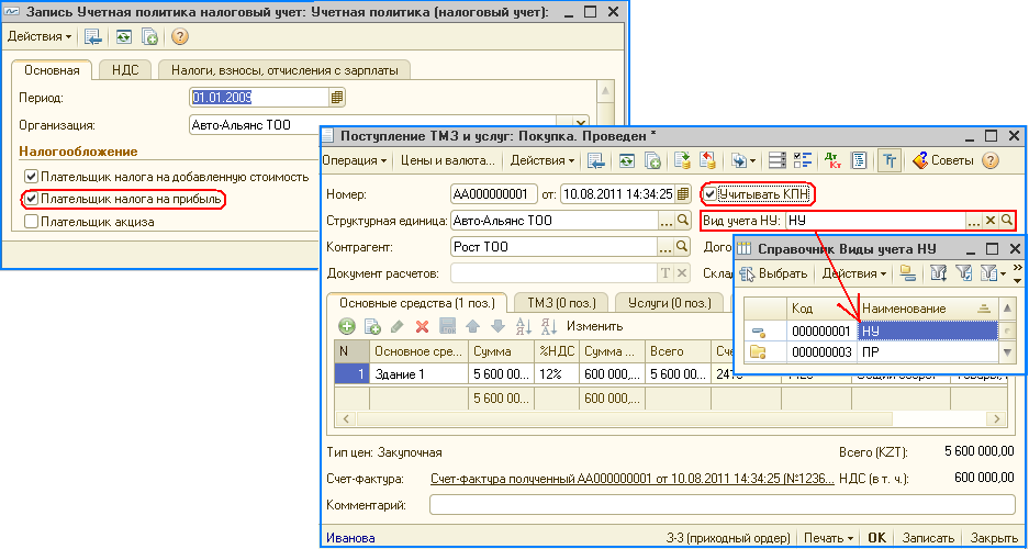 Для достижения этой цели в конфигурации «Бухгалтерия 8 для Казахстана» необходимо было создать механизм, который производил бы трансляцию всех хозяйственных операции в налоговом учете и тем самым формировал налоговую базу активов и обязательств. В связи с этим в редакции 2.0 в первичные документы добавлен признак «Учитывать КПН», который влияет на формирование записей по налоговому плану счетов. При этом каждая хозяйственная операция может быть отражена в налоговом учете с определенным видом учета: