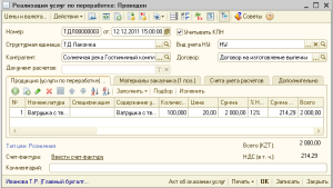 Шаг 4: Изготовленная из сырья заказчика готовая продукция и оказанные услуги по переработке отражаются документом «Реализация услуг по переработке» (меню Производство – Реализация услуг по переработке).